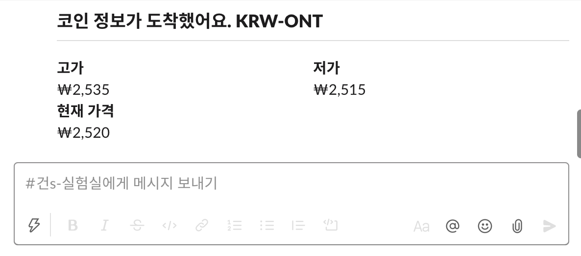 프로젝트를 빌드하고 실행하면 설정한 스케줄러의 실행간격마다 코인 정보를 슬랙으로 보내는걸 확인할 수 있습니다.