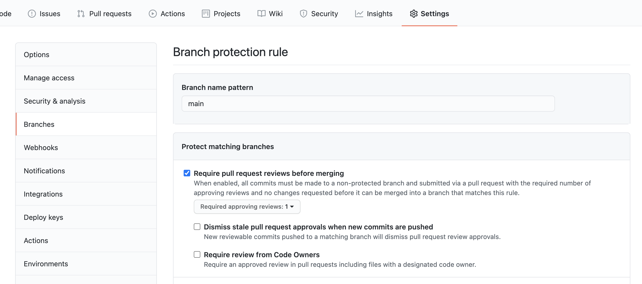 - Require pull request reviews before merging